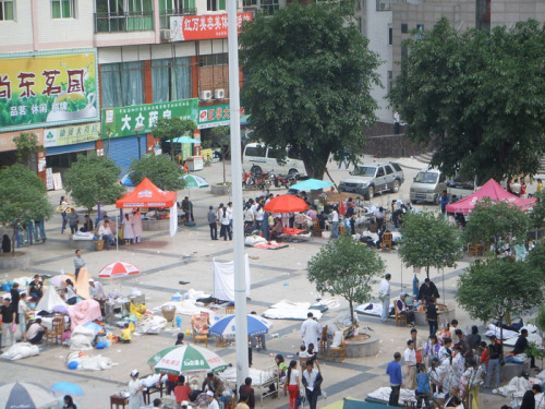 5.12汶川大地震引起医院旧住院大楼墙体出现了少量裂痕,5月12日下午2:30分各科室自发组织把所有的病人转移到天使广场上,县人民医院临时变成“野战”医院。新住院大楼具有抗震能力的建筑结构,但尾期装修尚未完全结束,设备器材还不夠齐备,原定于5月下旬才投入使用。为防止地震给病人造成新的伤害,保障住院病人的安全,院方当机立断,让这批避险的住院病人首先入住新楼。13日上午,在天使广场露天治疗一个通宵的病人陆续搬进新楼,得到了更为妥善的治疗护理。