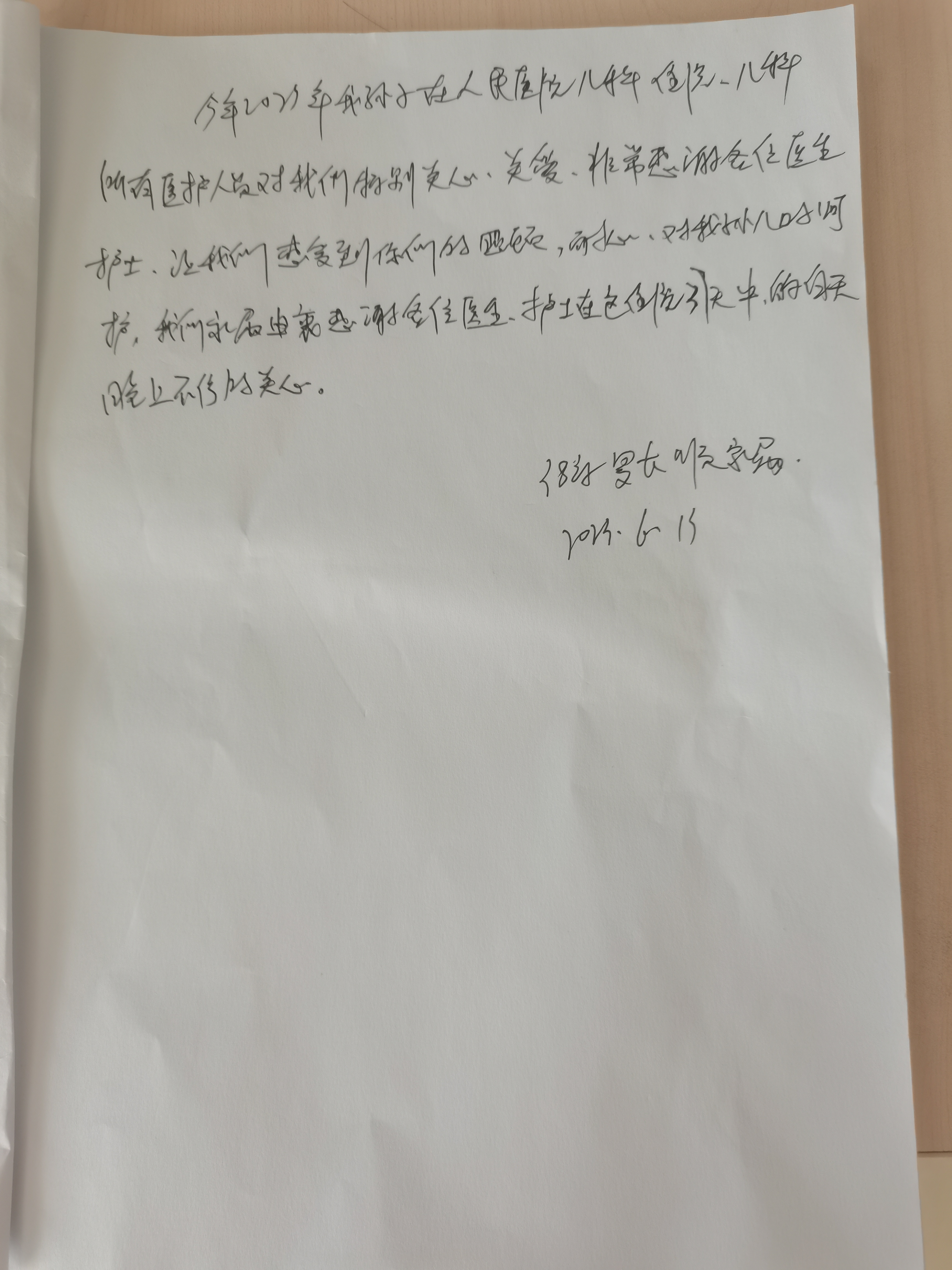 信义儿科收到患者家属感谢信
