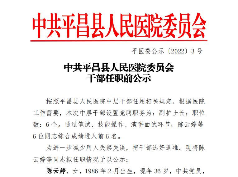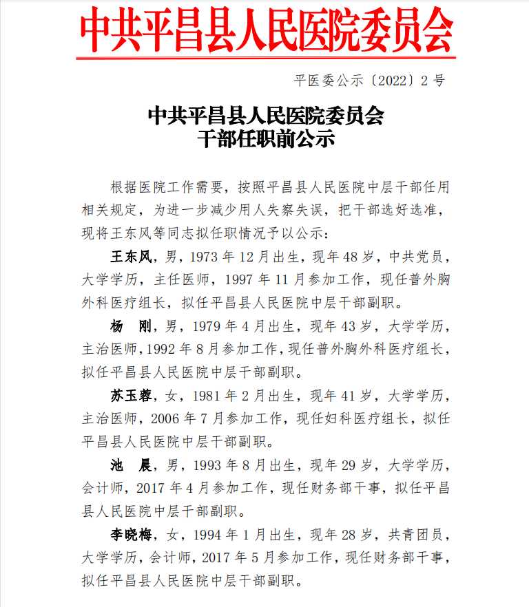 中共平昌县人民医院委员会关于米倩等同志任职的通知